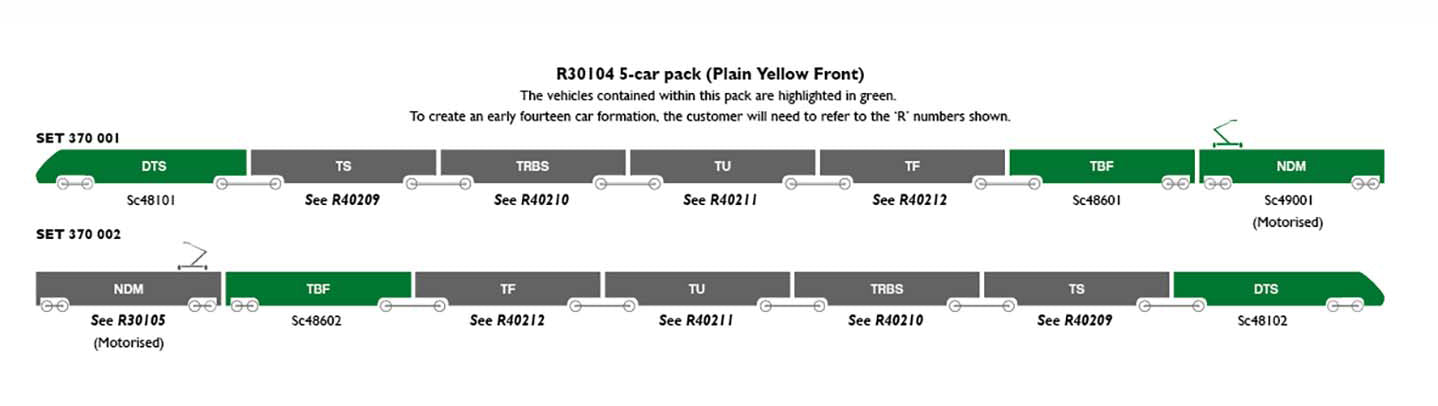 British Rail's Class 370 tilting trains, also referred to as APT-P (Advanced Passenger Train Prototype), were the pre-production Advanced Passenger Train units. The APT-P is the most powerful domestic train to have operated in Britain, setting the UK rail speed record of 162.2 miles per hour in 1979, a record that stood for 23 years. This TU 2-car Coach Pack features the Trailer Unclassified, as part of Sets 370001 and 370002.