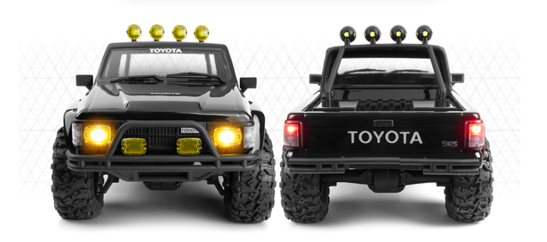 The Venture18 also marks the return of officially licensed Toyota products to the HPI Racing lineup. The meticulously crafted 1985 Toyota Hilux SR5 body features a clipless polycarbonate body, and it’s available in two striking color options – a Gloss Black and a vibrant Gloss Red with a bold stripe kit. The body is prepainted and also features clear windows, plus scale accents like Toyota emblems, front grill, door handles, wipers, functional mirrors, plus tube-style bumpers and rollbars for an impressive level of realism. The fitted LED light kit enhances the authenticity even further, giving the Venture18 that extra layer of detail that truly stands out!