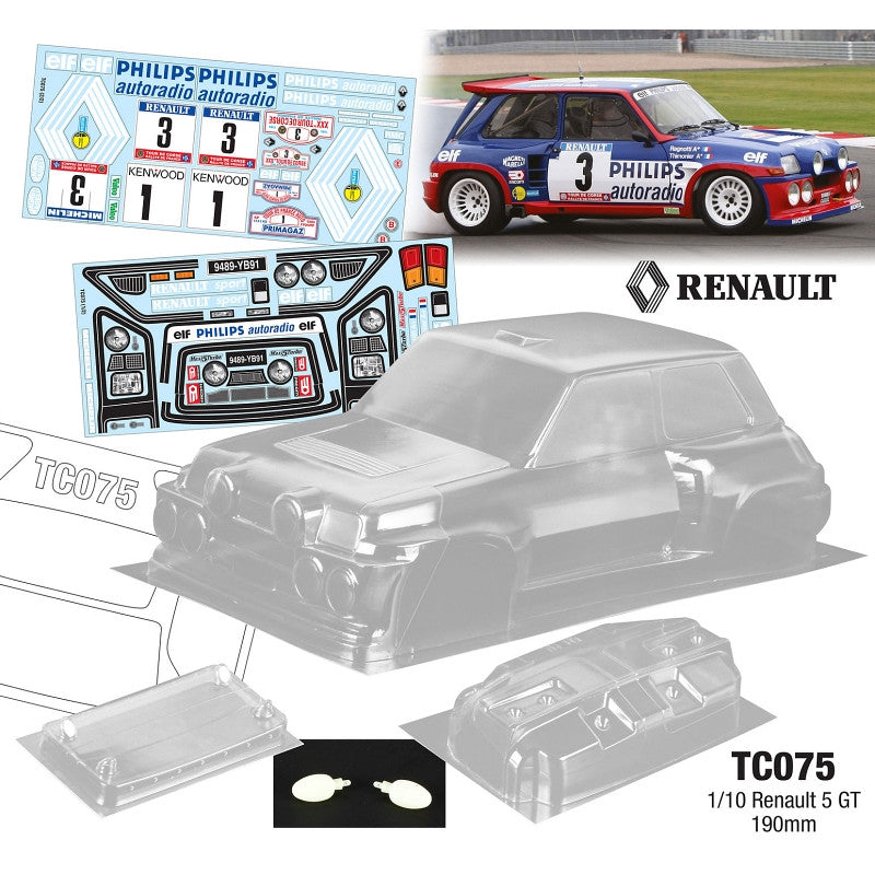 Renault 5 GTWB 258mmWidth 190mmClear Lexan Body W/Rear WingWith Light Buckles/MirrorsIncl:Renault 5 GT Decal SheetWindow Mask