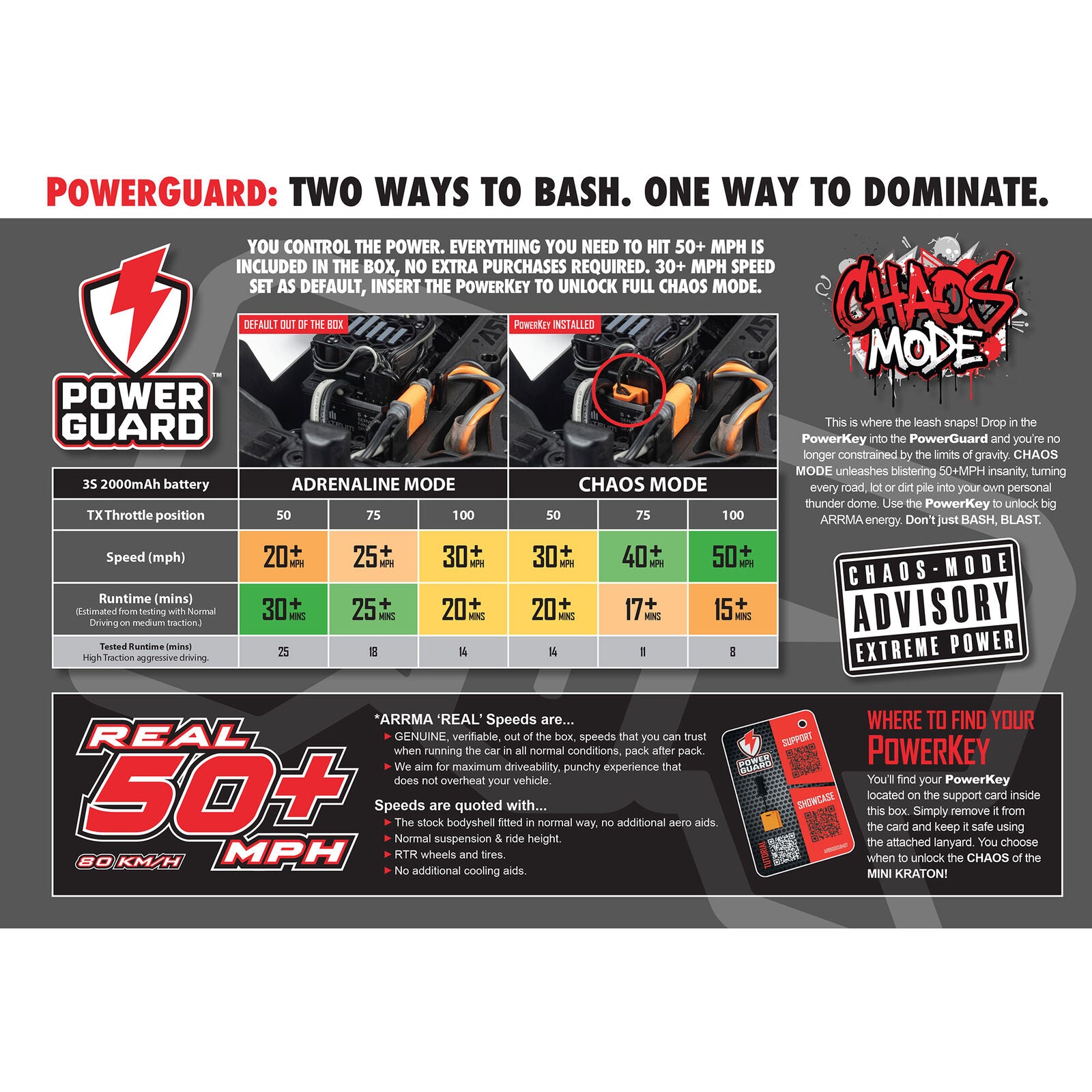 Then comes the power story that flips the script. The MINI KRATON 3S BLX is the first ARRMA vehicle equipped with PowerGuard. Right out of the box on 3S it runs at the sweet spot of 30+ mph and 20+ minutes runtime, great for everyone and perfect for dialing in your skills while still feeling the pulse of real brushless authority. If that's too much, flick a switch on the transmitter and open up 30+ minutes of play time. When your confidence rises and your grin widens it is time for the PowerKey. Plug it in and unleash full 50+ mph 3S muscle that turns this little powerhouse into pure KRATON chaos.