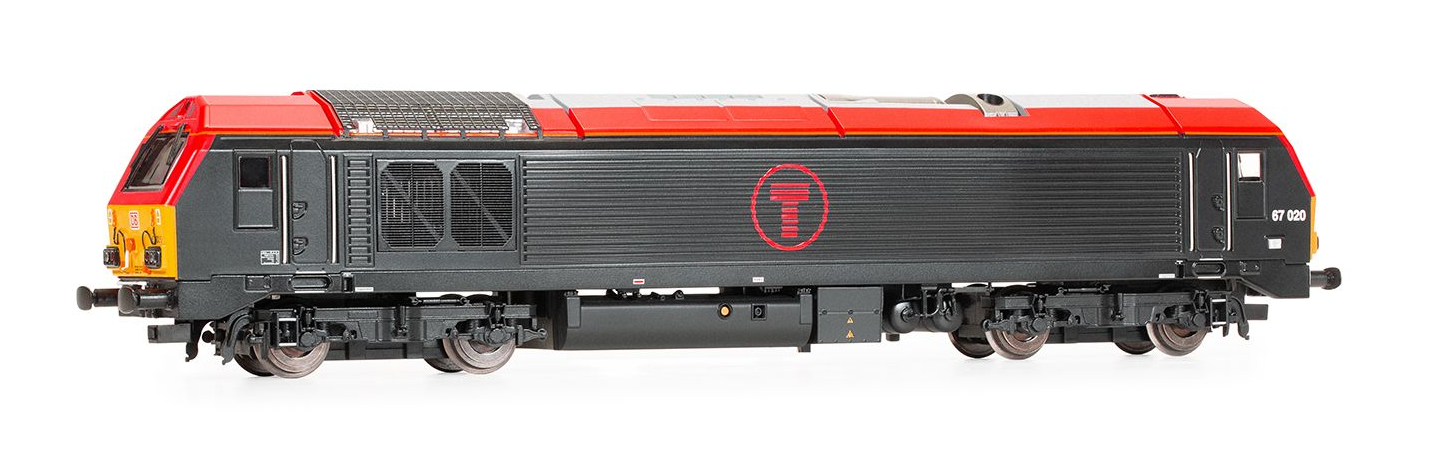 No. 67020 entered service in 2000 with a standard EWS red and yellow livery. The Class 67 locomotive was transferred to DB Cargo UK from EWS ownership in 2007. In October 2022, 67020 was transferred to Transport for Wales on lease from DB Cargo UK. To haul the TfW Mk4 coach sets, 67020 was repainted into a hybrid DB/TfW black and red livery with TfW branding.
